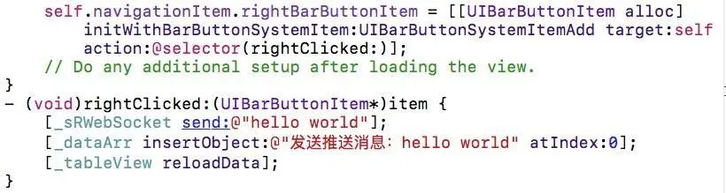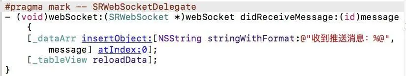 经过以上的两步,我们终于揭开了神秘的websocket服务器面纱,我们决定要是一步一步实现iOS应用的推送,废话不对说,我们新建一个iOS工程并导入SRWebSocket库(这里没有教程,自己弄),然后写一个表格视图和数组,我们把发送消息和接收消息存到数组中用表格视图展示出来,重点代码如下: