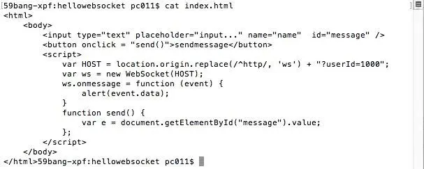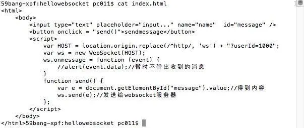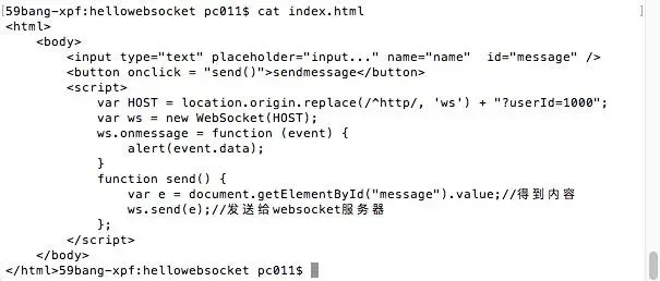 然后我们修改一下index.html文件,给指定的userId为10001的人发送消息,消息格式在websocket服务器中定义好了,所有我们index.html给websocet发消息时要遵从消息格式加上分隔符"^"等,代码如下: