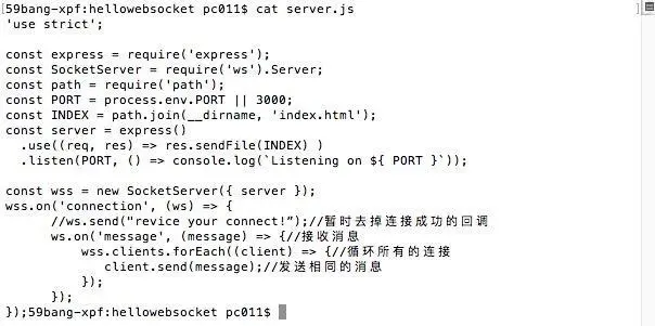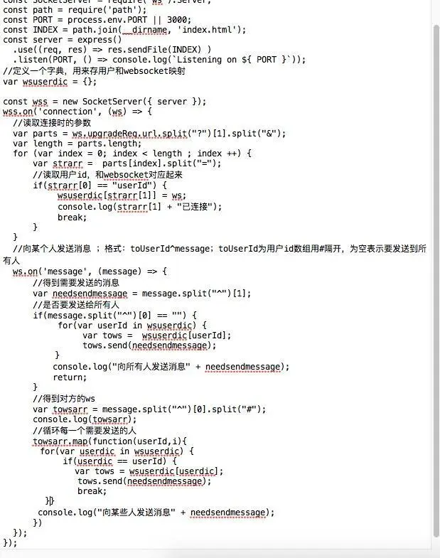 转入正题,我们既然都知道谁的连接是哪个了,那么我们接下来要做的就是在websocket服务器中接收消息(我们用index.html发消息,充当"业务服务器");然后websocket服务器判断消息是要发给谁的,然后在字典中找到那个socket连接,调用send函数即可(当然还有其他很多的方法,可能我这个不标准),我们修改server.js为以下代码: