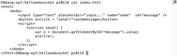 我们来创建一个网页,取名index.html,内容先简单点,点击按钮显示输入框的内容,还没有连接websocket服务器(server.js,以后不再注释):