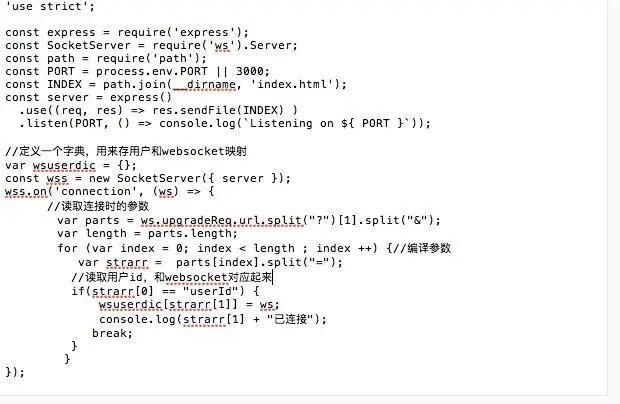 没错,我们就是要取出来这个东西,然后和websocket绑定,我们先在weboscket服务器文件上建立一个字典,然后连接的地方取出userId然后dic[userId]=websocket就可以了,为了看到效果,我们就把userId打印到终端显示吧,代码如下: