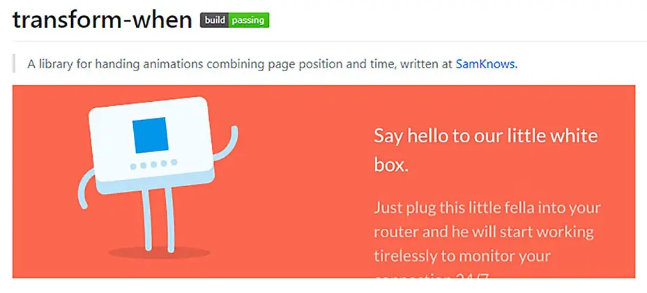 如果你想通过网页来讲述故事,Transform-when 是一个非常不错的解决方案,它主要帮你控制时间和滚动位置两个因素,帮你精确控制用户浏览故事过程中的每一个动效的体验。