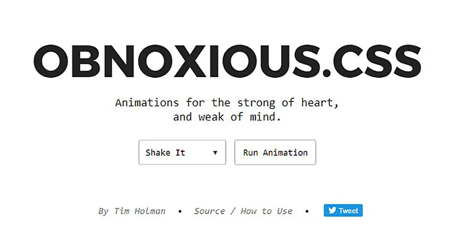 Obnoxious.css 涵盖了5种基于CSS的动效,能够让特定的元素摇摆,扭曲,放大,频闪,也能让字体字重自动变化。