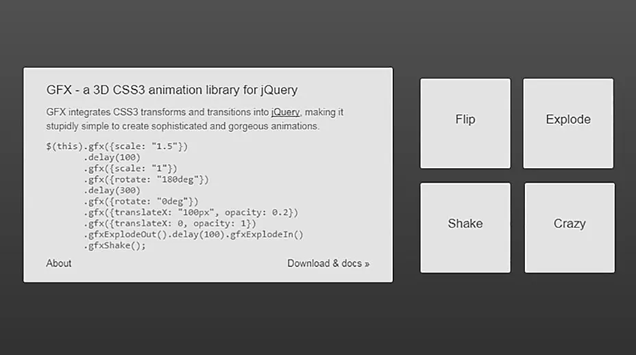 GFX 是一个引人瞩目的3D 动效库,它能以变成的方式来构建CSS3动画。它可以和jQuery 一起使用,输出你所需要的效果。