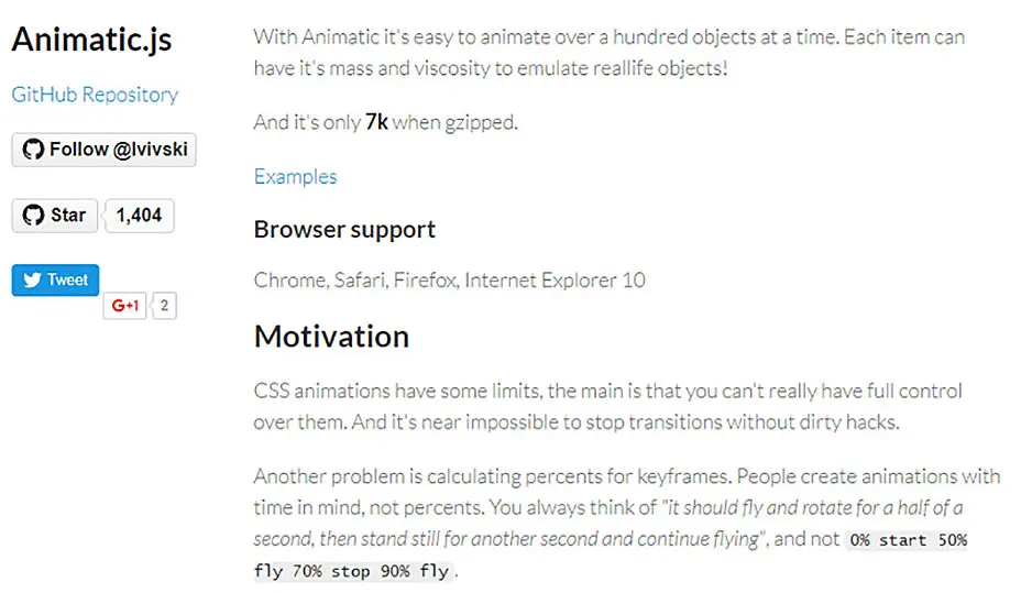 Animatic.js 是一款强大的跨浏览器的动效解决方案,它集成了物理运动规则,引入了CSS转换、3D转换和JS来实现功能。它的主要特色在于帮你减少一次生成多个不同对象所耗费的时间精力。