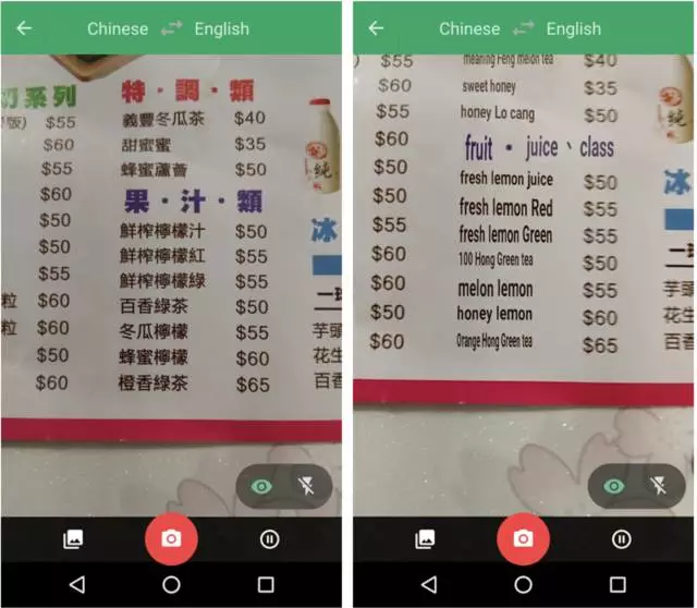 比如下面两张图片,你只用将相机对准菜单,选中的图片就可以通过Google翻译APP自动翻译成英文。