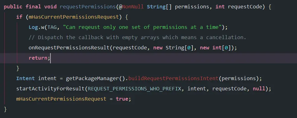 public final void requestPermissions(@NonNull String[] permissions, int requestCode) {