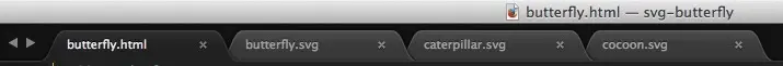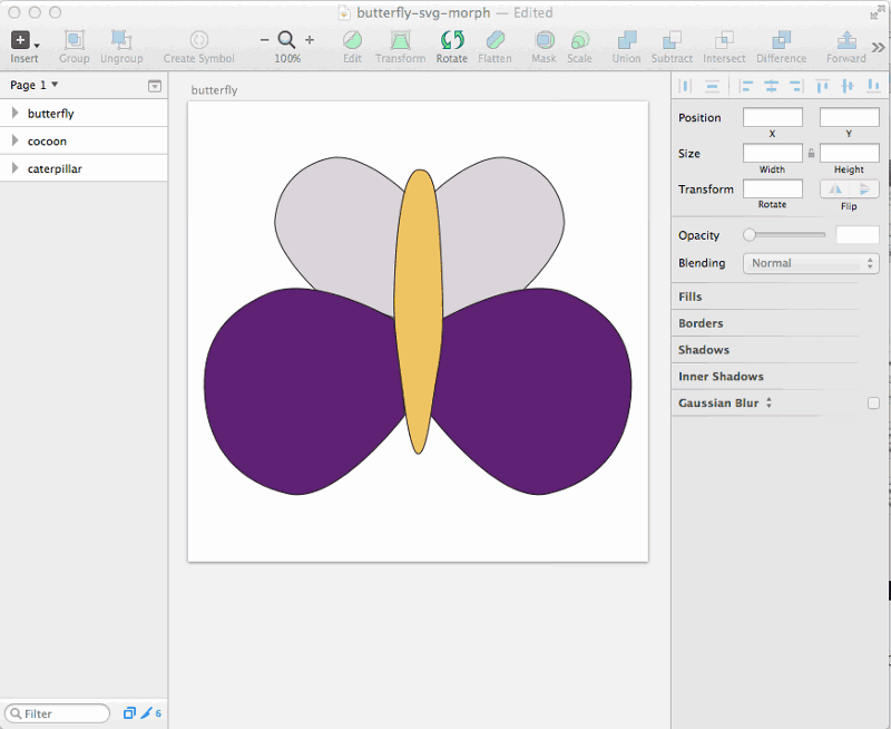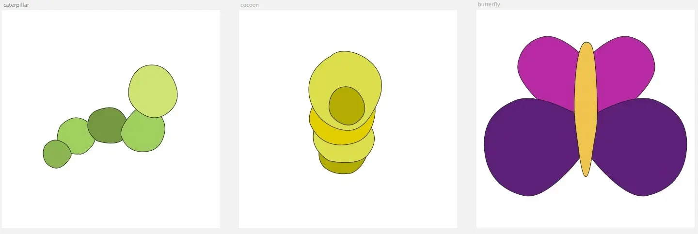 就这样一个蝴蝶图形就设计好了,并且还得到了SVG格式的文件。下面接着设计毛虫和茧的图形了...这部分就不再阐述了,跟上面蝴蝶图形设计差不多一样的步骤。(译者注:这里我主要是讲如何使用Snap.svg来创建SVG形变动画,所以设计部分就省略了,感兴趣的可以去看原文)。