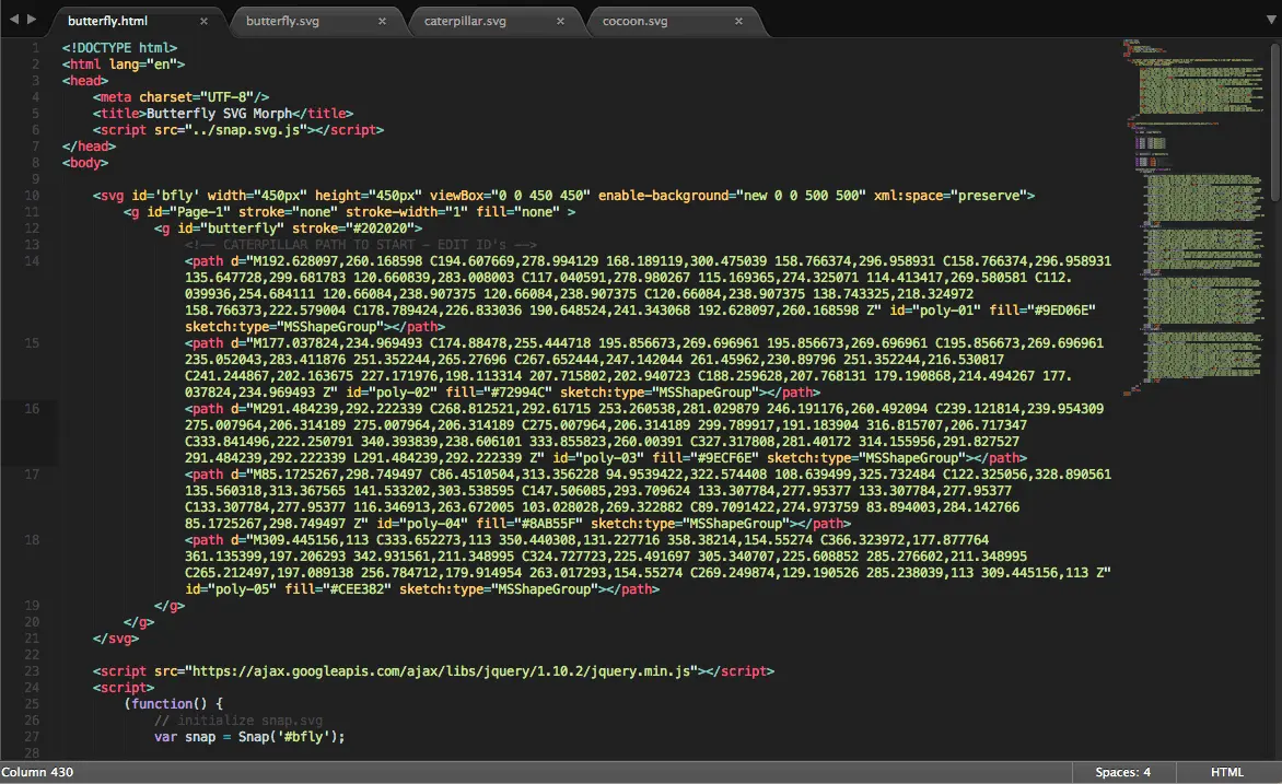 按照最初设想,形变动画是从毛毛虫开始,所以需要把毛毛虫图形的代码拷贝到HTML中去替换掉刚开始放在里面的蝴蝶图形的SVG代码。