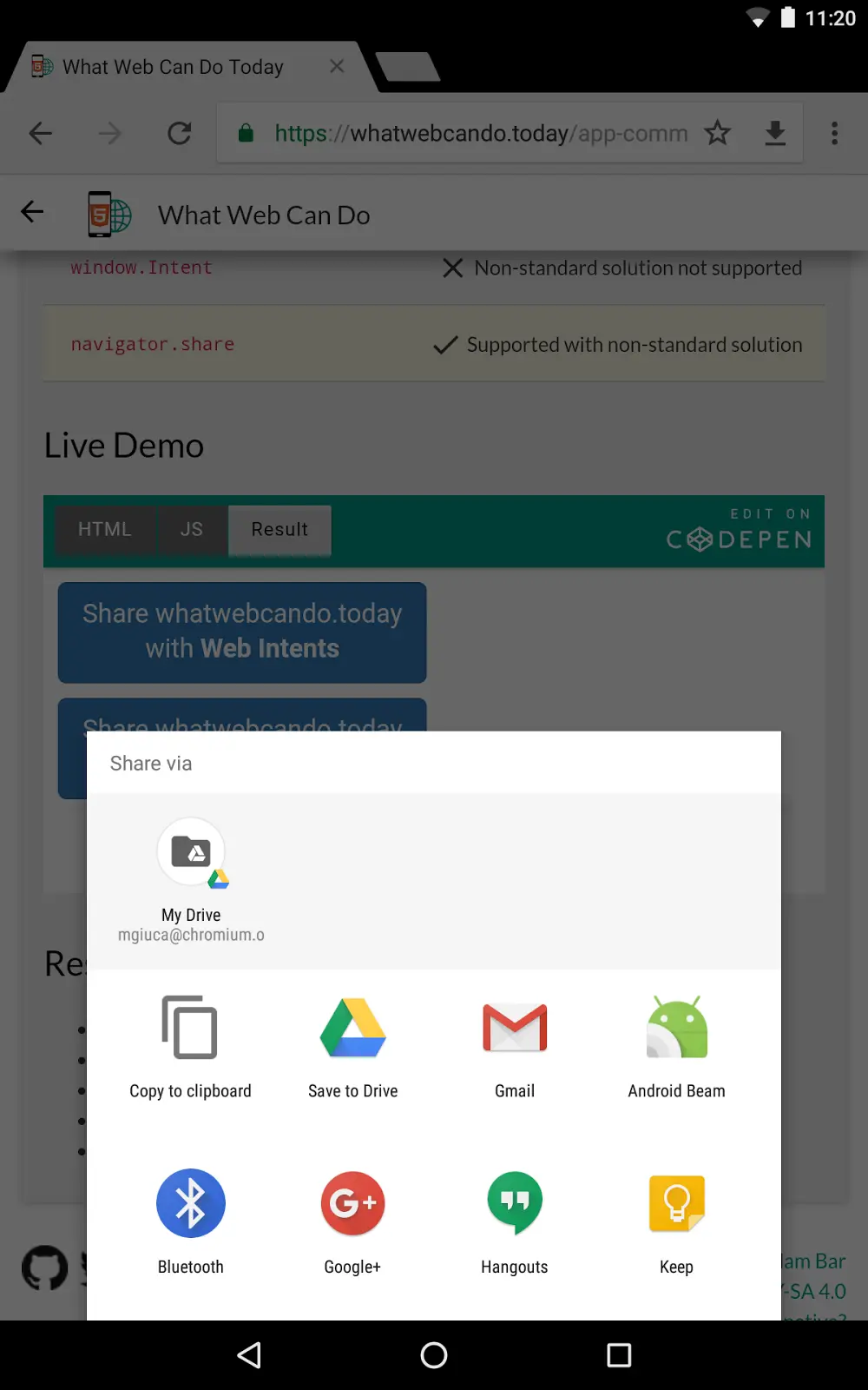 网站现在可以在 Chrome(Android 版)上使用新的 navigator.share API 来触发原生 Android 分享对话框,从而允许用户轻松地与其安装的任何本机应用分享文本或链接。在未来的版本中,此 API 还将能够分享给已安装的网络应用。
