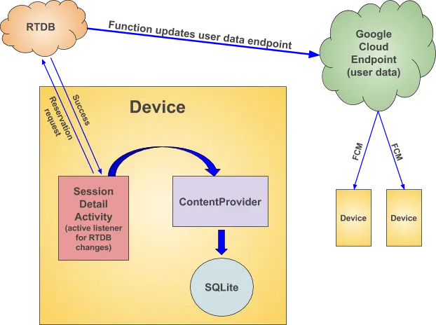 我们还必须设计出好的方案,将 RTDB 集成到整个 IOSched 同步逻辑中,尤其是由于 RTDB 提供的同步模型与我们之前在该应用中使用的先 ping 再 fetch 的方法大不相同。我们决定继续使用 Cloud Endpoints 在各个设备之间同步用户数据并与网络和 iOS 客户端同步(数据本身存储在数据存储区中)。尽管 RTDB 提供开箱即用的数据同步功能,我们还是希望确保用户的预订数据在所有设备上都是最新的, 即使应用未在前台运行。 我们使用一个云函数将 RTDB 预订数据集成到同步流中:一旦 RTDB 中更改了用户的预订数据,该函数即会更新端点,而这会触发向所有用户设备发送一个 Firebase 云消息传递下行消息,随后即会计划数据同步。
