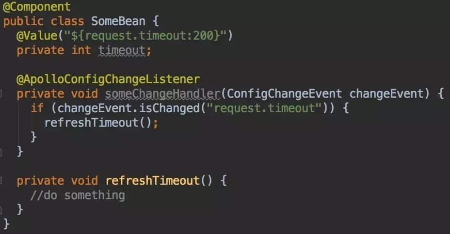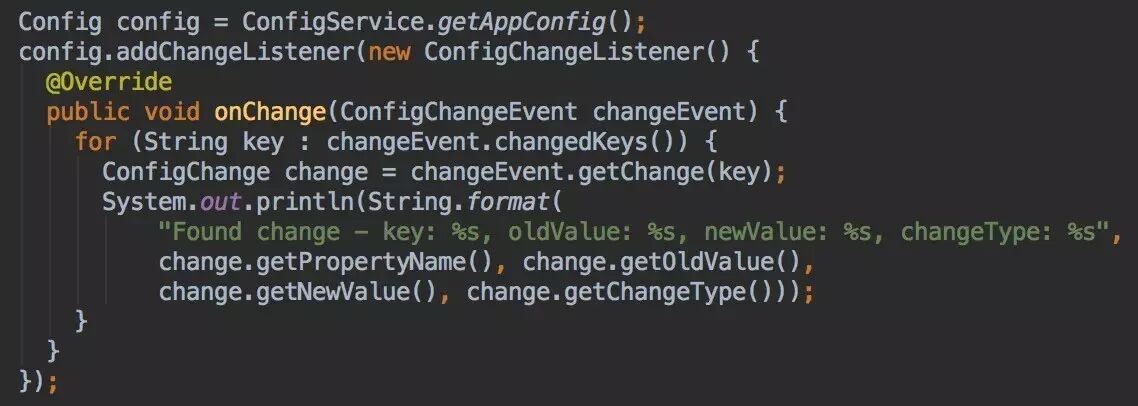 不过在某些场景下,应用还需要在配置变化时获得通知,比如数据库连接的切换等,所以Apollo还提供了监听配置变化的功能,Java示例如下: