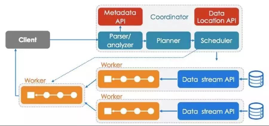 从Presto后面给出的这些数据可以看到,这种层面上的一个提升。基于ORC的文件存储,它的提升应该是5倍或者10倍,10倍到20倍的提升。它的架构简单来说是有一个Client,然后这个Client提交SQL语句过来,前面有一个Planner和Scheduler,会把相应的SQL的东西分层,分成不同的Stage,每一个Stage有多个Task,这些真正的Task是运行在不同的Workers上面,利用这些Workers去数据源读取数据。