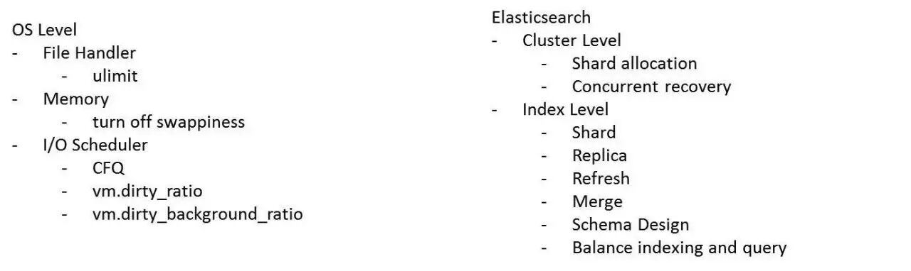 索引级别的优化就是我要对Shard的数目,到底是这个Index是分十个Shard存还是5个来存,refresh的频率,Refresh就是说这个数据写入多久之后可以被搜索到。Refresh时间拉得越长,数据吞吐量越大,但是可以被搜索到的时间越滞后。还有Merge的过程,因为分片,为了减少对文件句柄使用, 所以需要进行Merge。有人讲就是因为ES支持Schemaless了,所以不需要fixed的Schema。但在实际的使用过程中发觉,如果不做一定限制的话,每个人都认为是自由的,就会出现一个Field的急速膨胀,在某个索引下面成千上万的字段, 这样一来索引的写入速度就下来了。