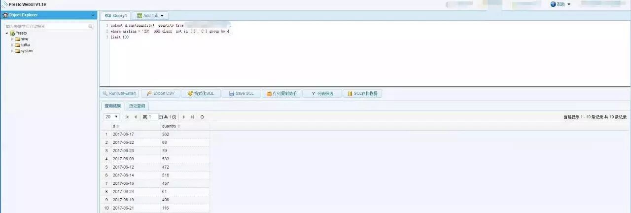 这是前面提到我们统一的一个SQL查询的接口,大家可以看到这挺简陋的,很傻很天真的样子,我就是上面输入一个SQL,下面很快就出来一个结果。但就是因为采用了这种方式,因为后面是它采用了Presto这个引擎,在部门内部,我们有不少同事都在使用这个进行数据查询,目前的日常使用量应该是在近8K的样子,因为最近还升级了一下网卡,升级到万M网卡,使得速度更加快。多余的时间喝喝咖啡抽抽烟生活多美好,比等在那里焦虑有意思多了。