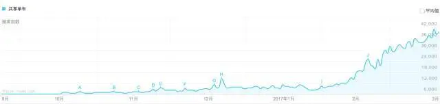 相较之下,回顾「滴滴」的百度指数曲线,达到 36000 的成绩用了一年半。如果以「摩拜单车」作为对比参照物,摩拜单车半年时间的百度指数竟然突破 60000,峰值更是达到 76000。