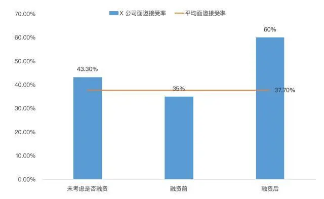 而如果考虑到 X 公司融资情况,情况则更有不同。融资前,面邀接受率为 35%,与平均水平相当;但融资后,面邀接受率为夸张的 60%。