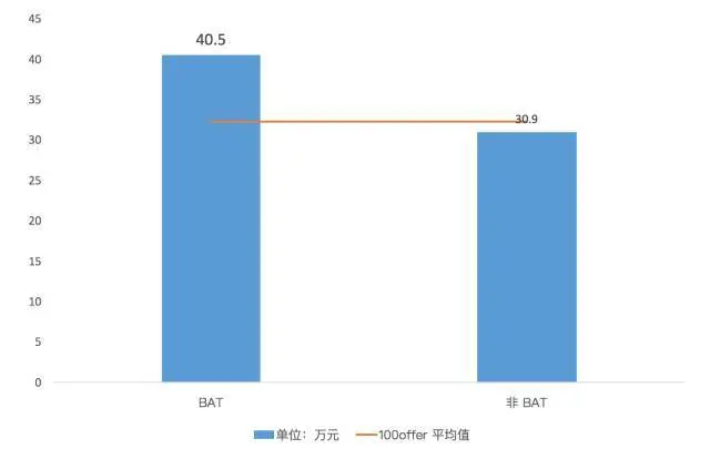100offer 已有数据显示,出身大厂(以 BAT 为代表)的候选人更容易获得高额薪资。BAT 出身的候选人在 100offer 上获得的人均 offer 年薪是 40.5W,相比非 BAT 出身的候选人 offer 年薪 30.9W,高出 31%。而如果综合考虑,100offer 上所有候选人的 offer 平均年薪是 32.2W。
