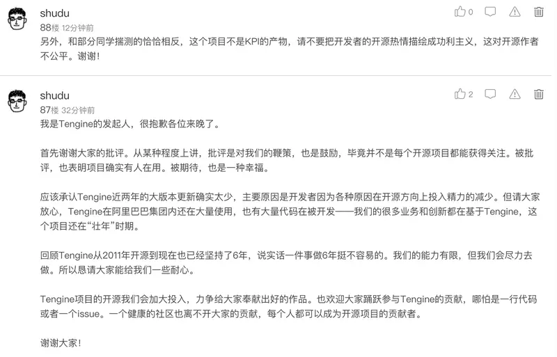 今天下午,Tengine 的发起人 @shudu 回应了该新闻,承认了过去一段时间的确更新太少,并表示会加大对该项目的投入,力争奉献更好的产品,同时也鼓励大家踊跃贡献。
