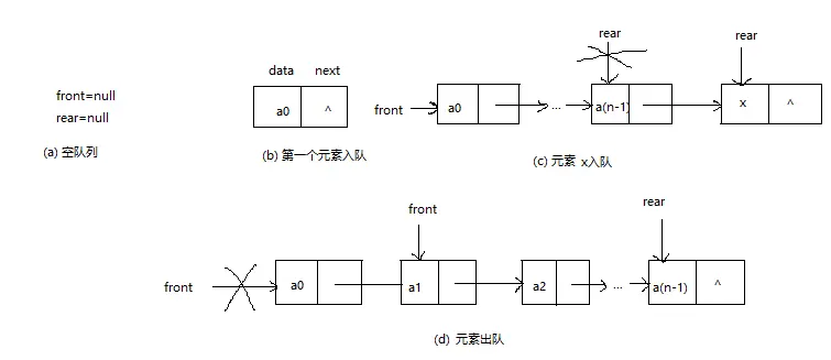 front=null,rear=null。② 数据类型是单链接结点类,成员变量