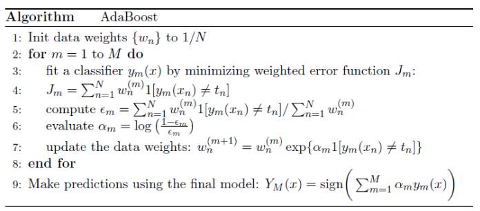 下面的算法阐述了最广泛使用的 boosting 算法形式,称为 AdaBoost,是 adaptive boosting 的缩写。
