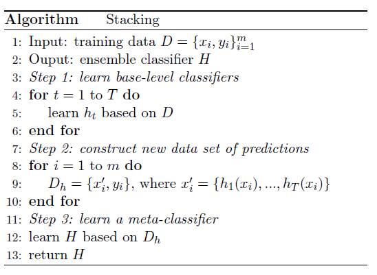 基础层次通常由不同的学习算法组成,因此 stacking 集成通常是异构的。下面的算法概括了 stacking 算法的逻辑: