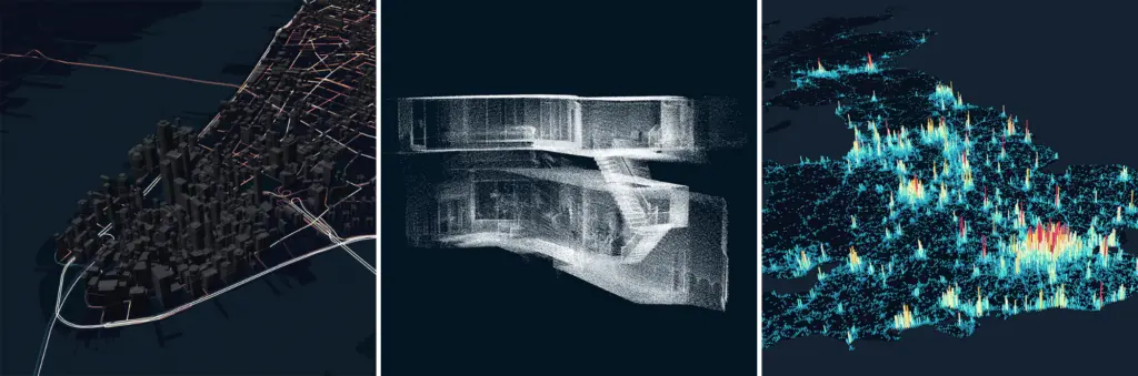 deck.gl layers render GeoJSON, point cloud, and grid visualizations.