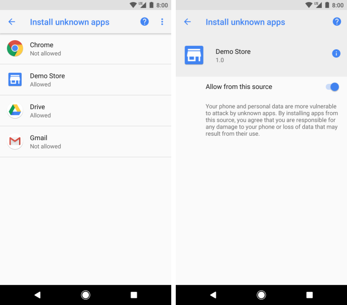 此新权限为用户启用安装可靠来源应用提供清晰、可控和简化的流程。Settings 应用显示用户批准安装未知应用的应用列表。用户可以随时撤消特定应用的权限。