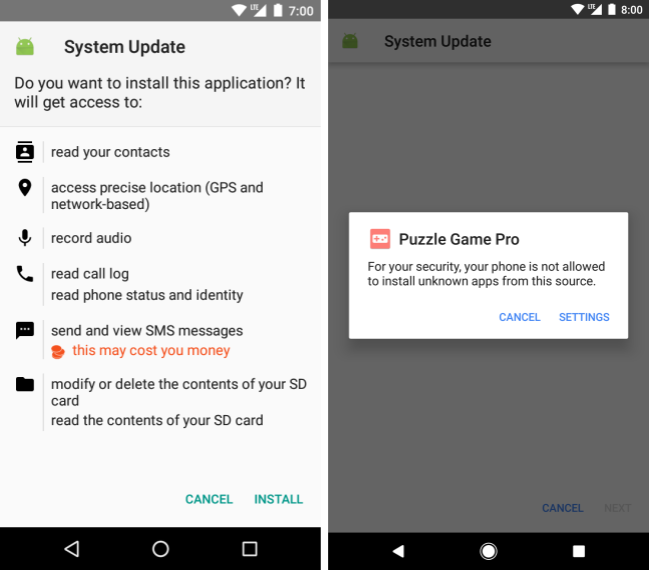 左侧(Android O 之前的版本):伪装成系统更新的 PHA 的安装界面。右侧 (Android O):在安装 PHA 之前,用户必须首先向此应用授予权限才会触发安装。
