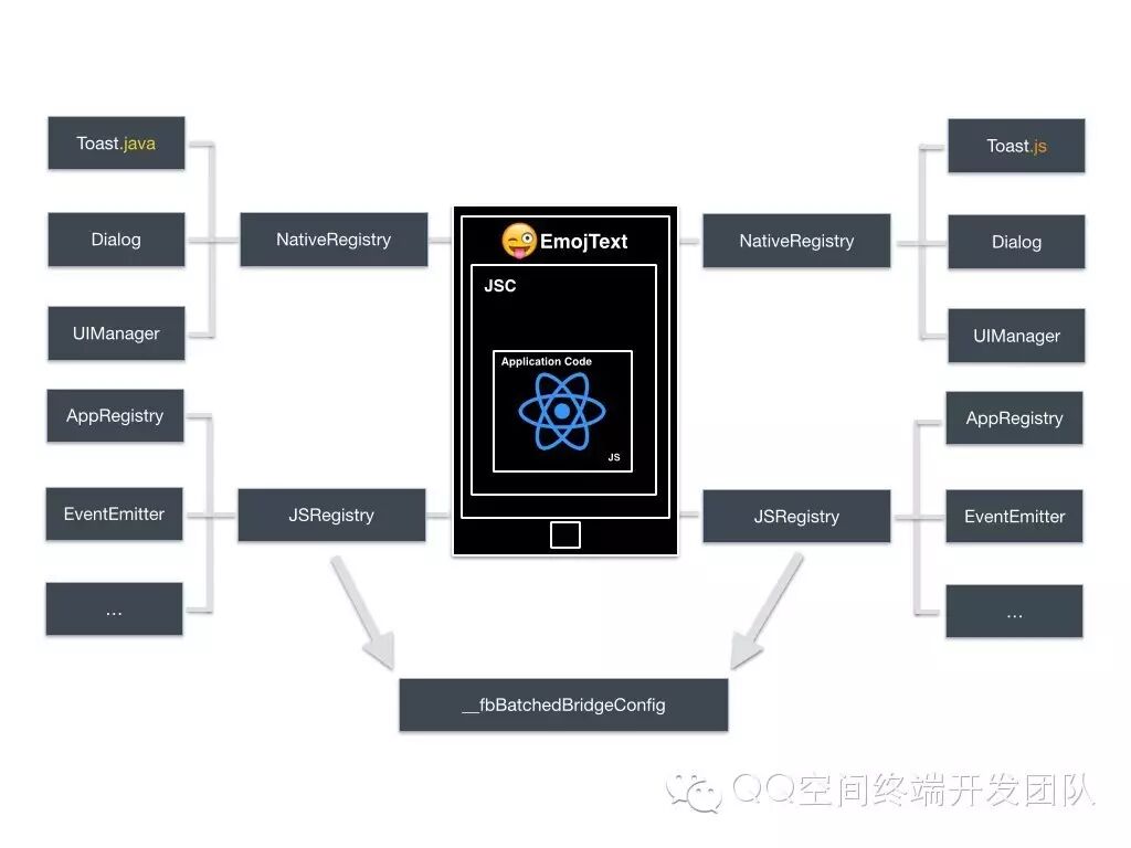 ReactBridge将注册表信息存入与前端互通的全局变量 __fbBatchedBridgeConfig 中,使得Js层与Java层存在同样的模块注册表。