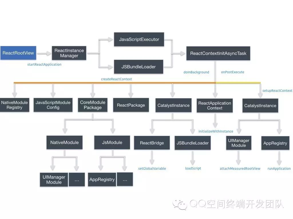 正如上面FB攻城狮提出的时序图,从终端启动,入口是ReactRootView.startReactApplication,在构造JavaScriptExecutor&JSBundleLoader后, 进而通过ReactContextInitAsycnTask去创建ReactContext,这部分主要创建了NativeModules,JavaScriptModule及其对的注册表,负责Js与Java通信的高层接口CatalystInstance等。在创建完ReactContext后,通过CatalystInstance获取AppRegistry并调用其runApplication启动Js
