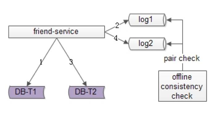 数据的双写不再由好友中心服务来完成,而是由线下的一个服务或者任务来完成,如上图1-6流程: