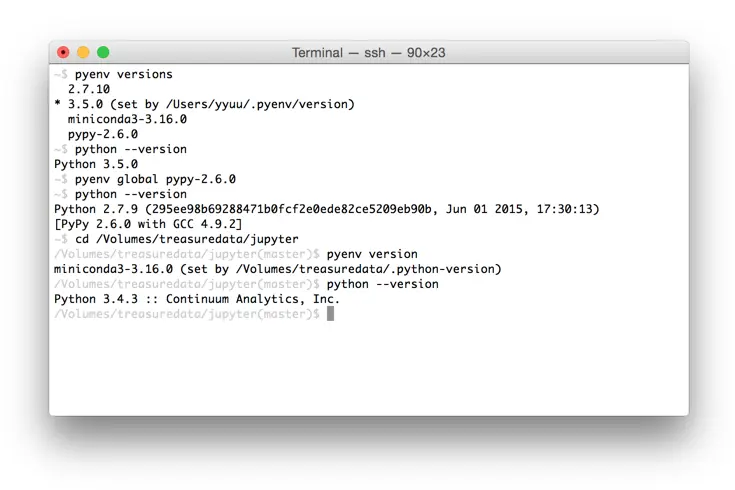 .python-versionfile in the current directory (if present). You can modify the current directory's.python-versionfile with thepyenv localcommand. -