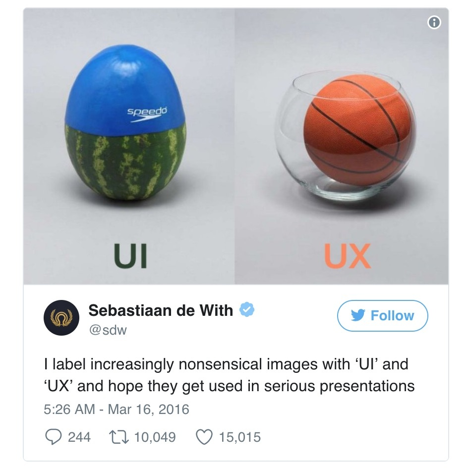 是的,这些图片。我不想让你们觉得我是那个辛普森动画中朝着天空吼叫的老人,但是大部分用于比较 UI 和 UX 的图片都没有戳中要点。一位名叫 Sebastian de With 的设计师在他一年前的推文中也表达出了相同的观点。
