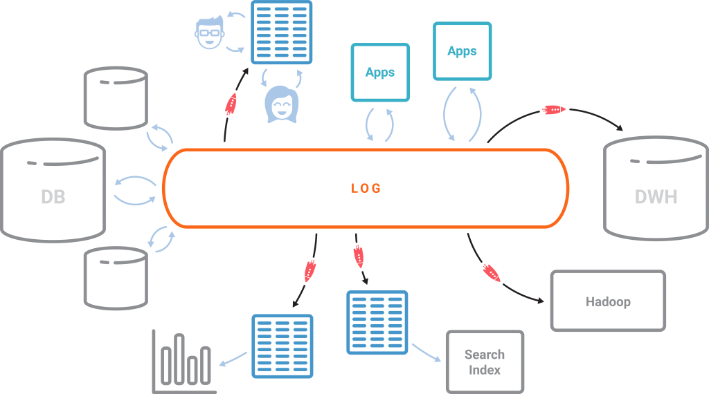 传统关系型数据库以表为核心,日志只不过是实现手段。而在以事件为中心的世界里,情况却恰好相反。日志成为了核心,而表几乎是以日志为基础,新的事件不断被添加到日志里,表的状态也因此发生变化。将Kafka作为中心日志,配置KSQL这个引擎,我们就可以创建出我们想要的物化视图,而且视图也会持续不断地得到更新。