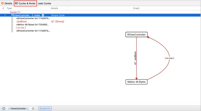 Leaks 里还有一个选项 Cycles & Roots 能够分析出有循环引用的地方,如下图所示: