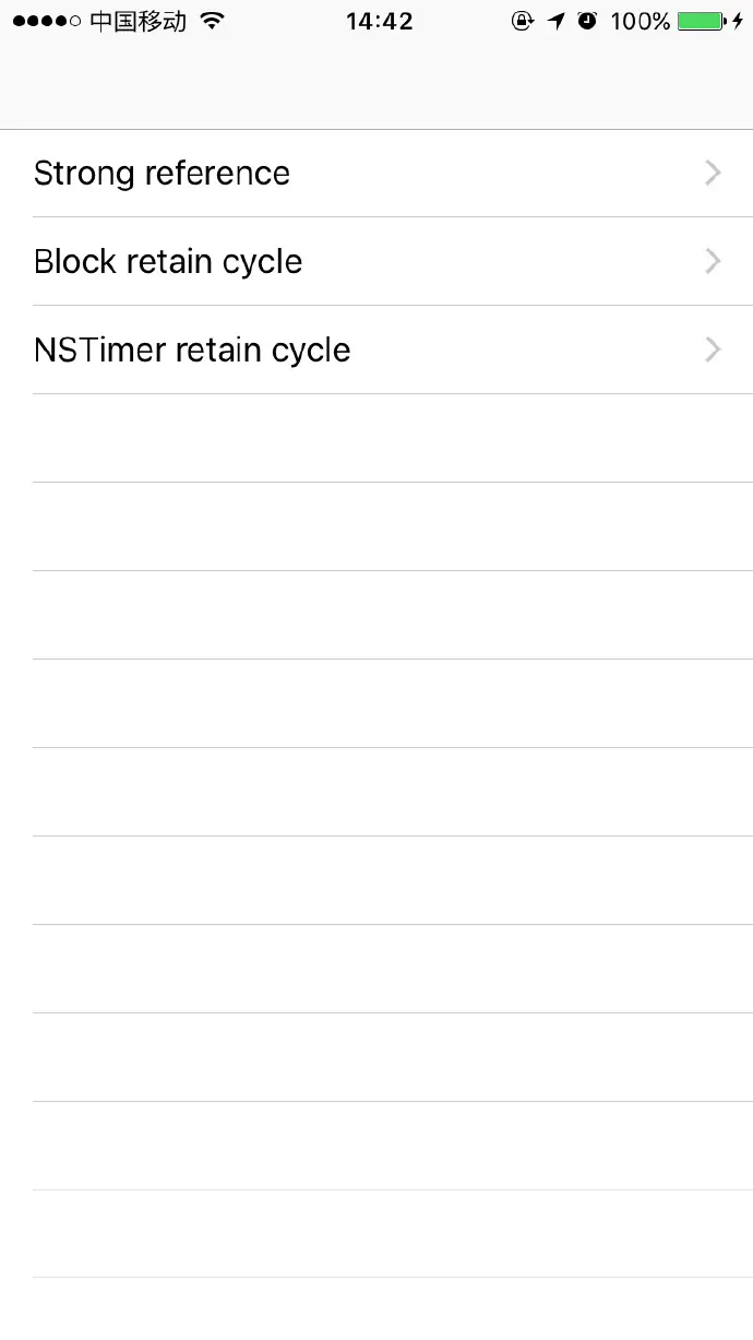 - Strong reference 是用一个数组强引用了一个 ViewController,导致这个 ViewController 退出 navigation stack 后还被强引用引起内存泄漏