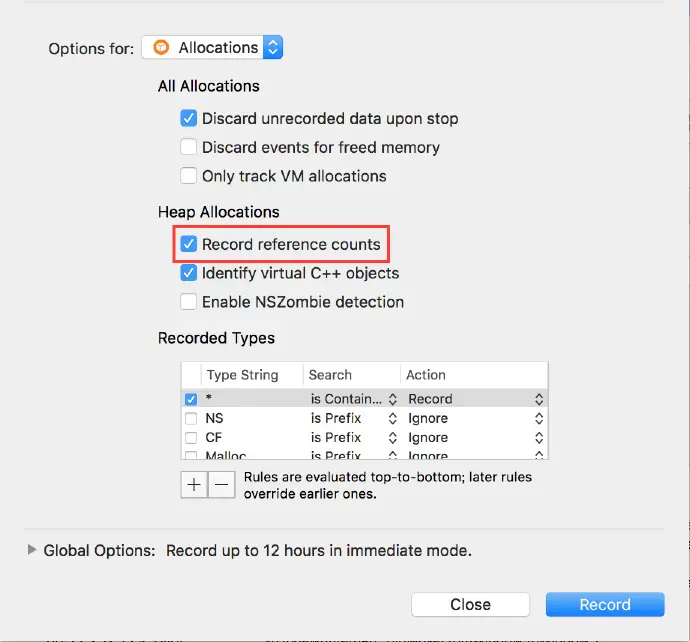 如果要更进一步查看某一个类的引用计数情况,我们可以打开 Record reference counts,具体操作如下图所示: