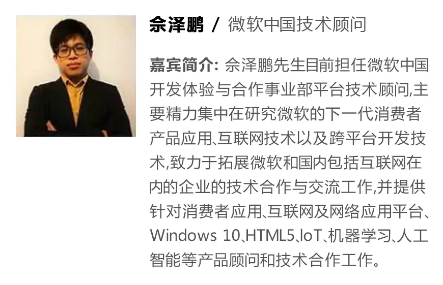 内容来源:2017年5月13日,微软(中国)开发体验与合作事业部技术顾问佘泽鹏在“HTML梦工场&微软开发者沙龙第06期”进行《Web与人工智能时代》演讲分享。IT大咖说作为独家视频合作方,经主办方和讲者审阅授权发布。