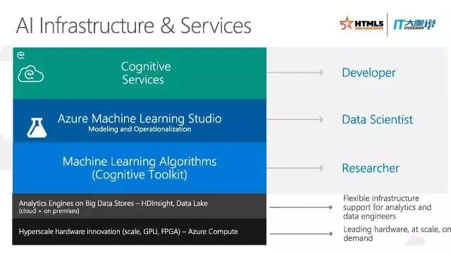第三层是Machine Learning的算法,Cognitive Toolkit。提供了开源算法的工具包,研究人员可以用工具包来写自己的算法并研究相应的人工智能技术。
