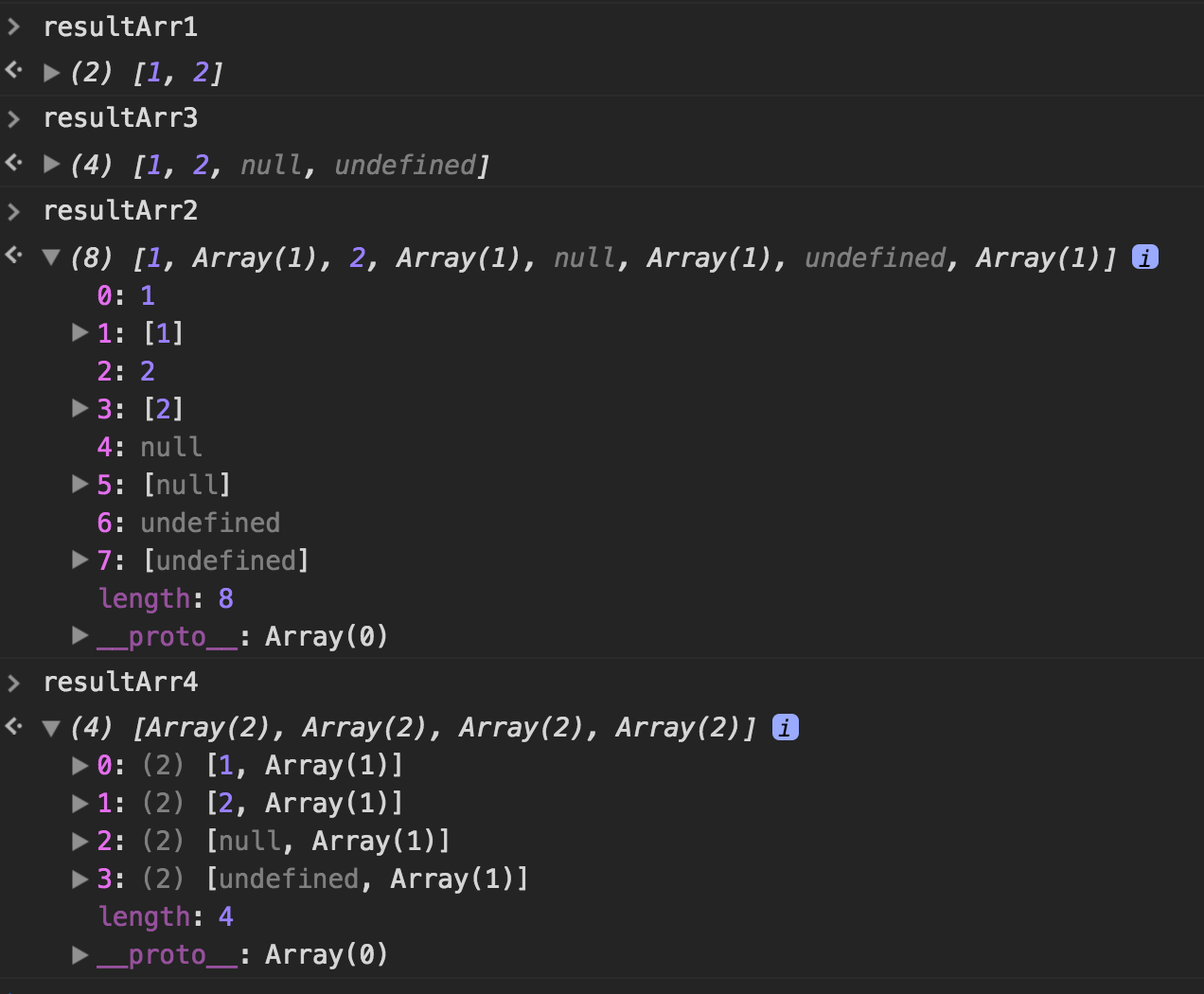 resultArr1和resultArr3的区别是$.map把undefined和null给过滤掉了。resultArr2与resultArr4的区别是$.map把回调函数的返回值给铺平了。