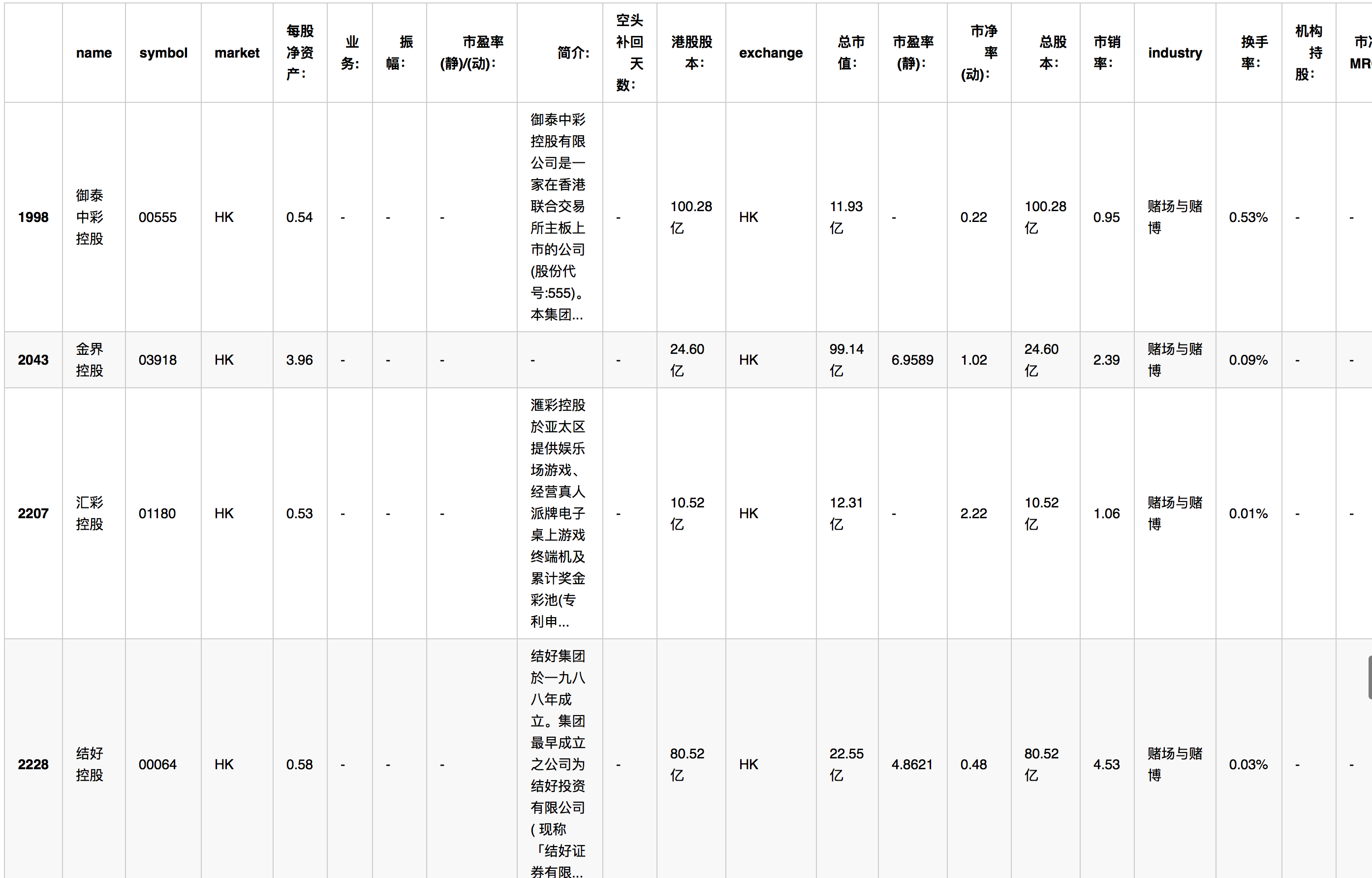 91 气体供应如果你对上面行业分类中的序号6:赌场与赌博,序号9:中国房地产,比较感兴趣,可以使用如下方式查询这两个行业中的所有股票信息: