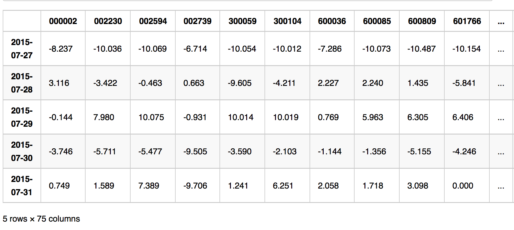 len(all_choice_symbols)75如上所示abupy内置沙盒中的symbol共75个,下面组装这75个symbol形成一个三维panel数据,摘取所有数据的p_change(涨跌幅)列形成二维dataframe对象,如下所示: