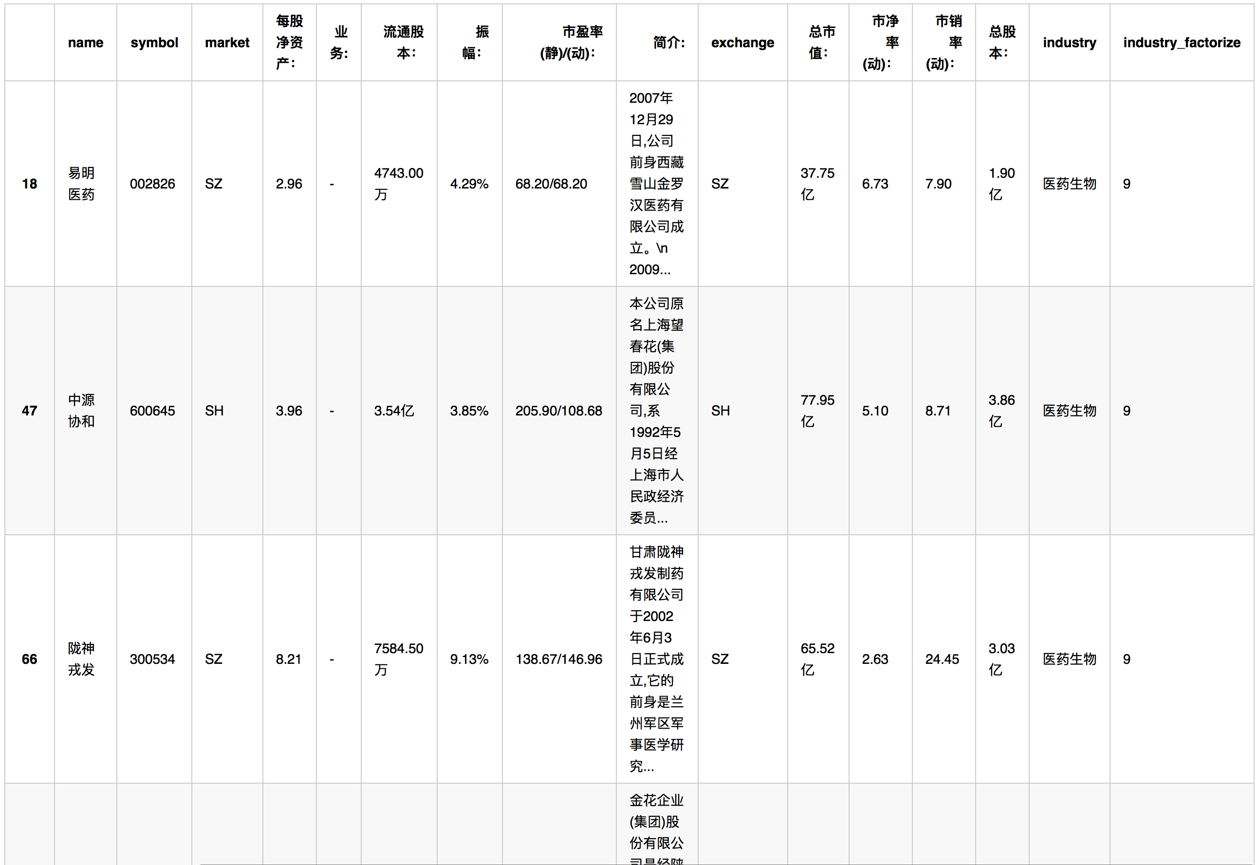 ABuIndustries.query_match_industries_symbol('医学', market=EMarketTargetType.E_MARKET_TARGET_CN)[:5]['sz002826', 'sh600645', 'sz300534', 'sh600080', 'sz300595']小节: