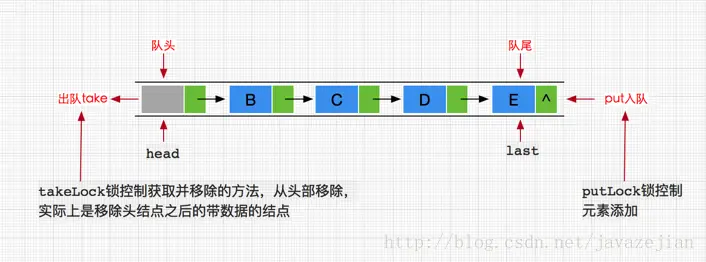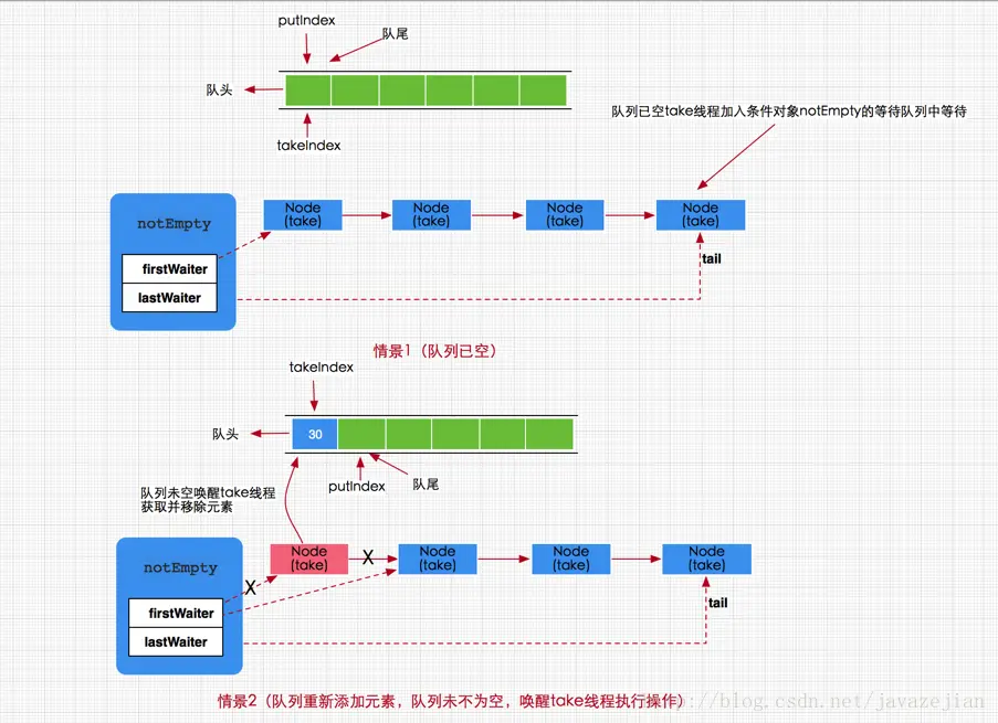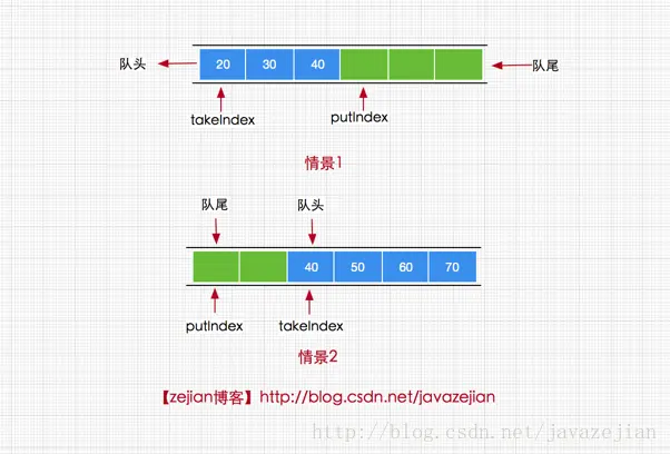 2.数据存储容器不同,ArrayBlockingQueue采用的是数组作为数据存储容器,而LinkedBlockingQueue采用的则是以Node节点作为连接对象的链表。
