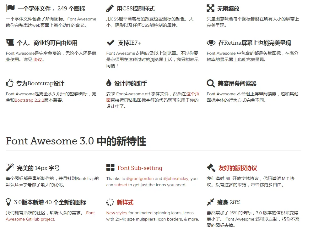 大家比较熟知的的字体图库有很多,这里就说一个吧,font-awesom,截图看看他的好处吧有了他,根本不担心图标的问题了,很简单的使用,只需要引入之后,按照规则写html标签即可