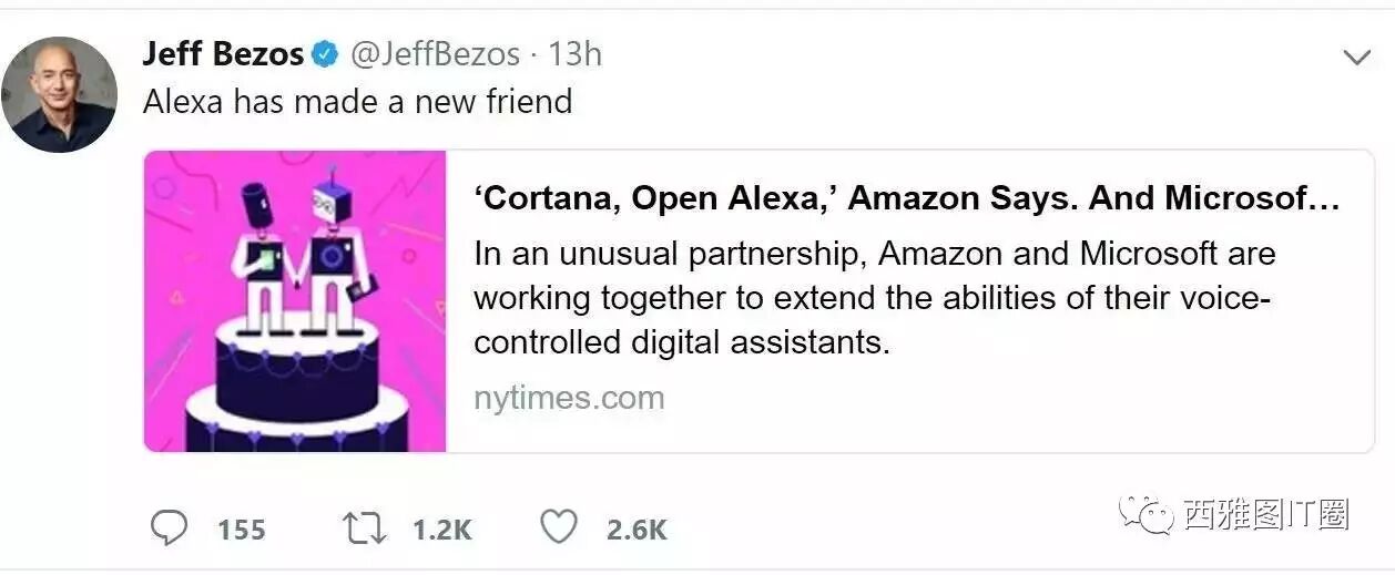 周三早上亚马逊CEO发推文说, Alexa交了一个新朋友。
