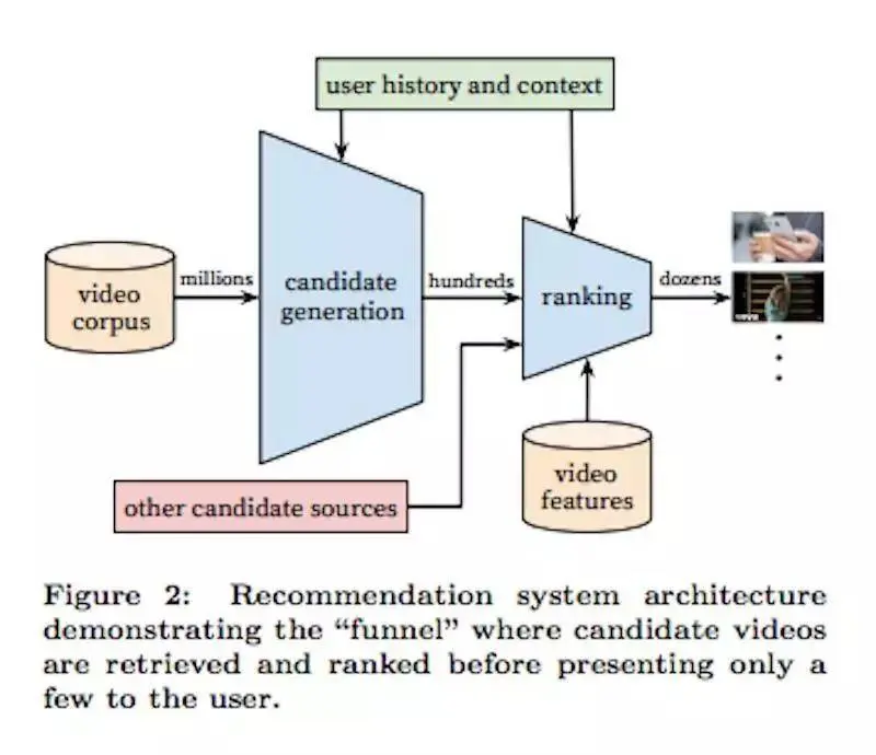 推荐视频是通过候选生成器与排名过滤器的筛选出来的,这两大过滤器决定了YouTube如何读取、筛选视频,如何生成推荐列表。