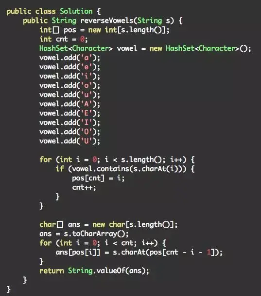 本题中只需要反转元音字母,同样的,我们希望知道每个元音字母在反转后应该出现在什么位置。因此我们用一个position数组记录元音字母的位置,然后进行反转即可。算法复杂度为O(N),N是字符串长度。