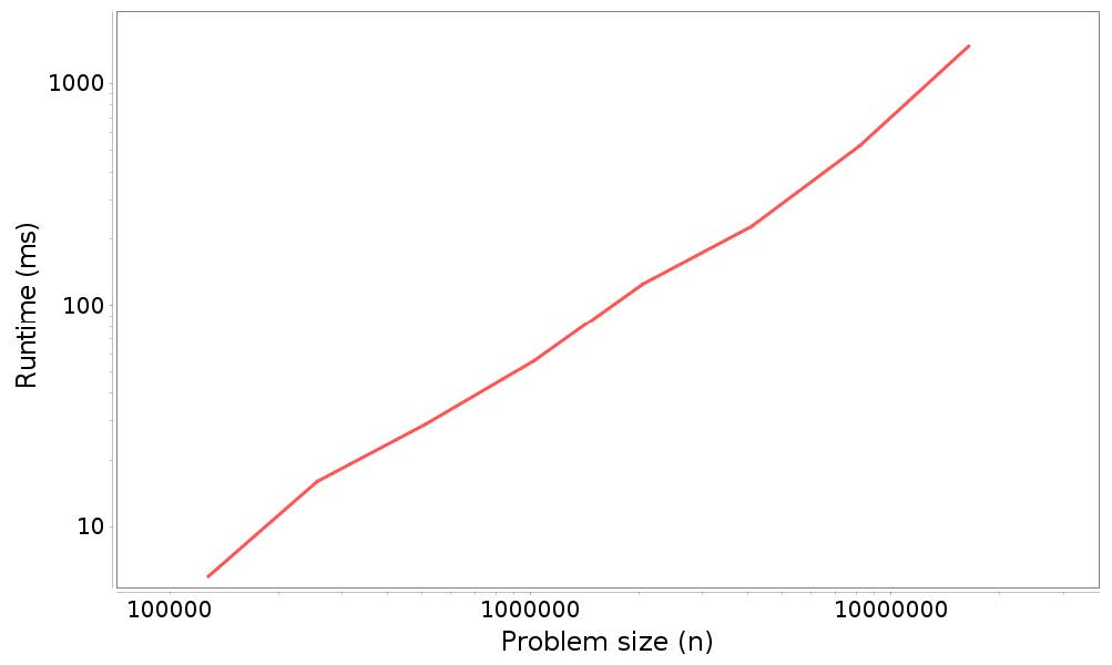 为了测试这个理论,我们可以绘制总运行时间和问题规模,我们应该看到一条直线,至少对于大到足以准确测量的问题规模。在数学上,我们可以为这条直线编写一个函数: